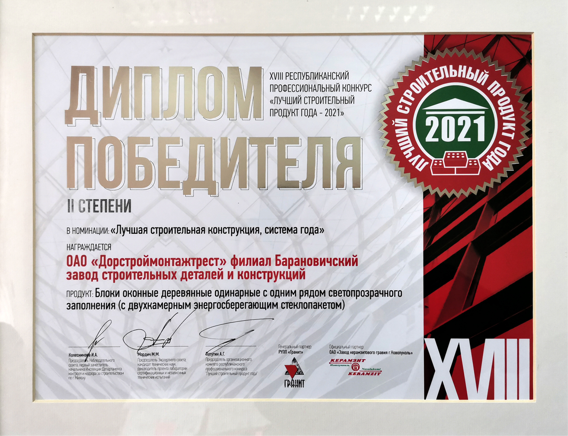 В номинации Лучшая стоительная конструкция (система) года были представлены блоки оконные деревянные с одним рядом светопрозрачного заполнения (с двухкамерным энергосберегающим стеклопакетом). Номинированная продукция признана победителем, получен диплом победителя II степени.